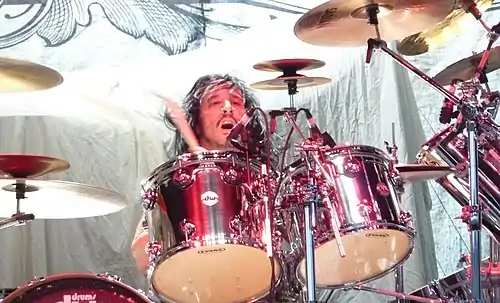 In September 2003, Dias was fired from Soulfly by Cavalera and his wife Gloria (the band's manager), which prompted Doling and Mayorga to leave.[8] The departed members were quickly replaced by returning drummer Nunez, Primer 55 guitarist Bobby Burns on bass, and former Ill Niño guitarist Marc Rizzo.[9] The group's lineup subsequently remained stable for a number of years, before Burns left in July 2010, shortly after the release of Omen.[10] Fireball Ministry's Johny Chow filled in for a string of tour dates,[11] before Tony Campos (formerly of Static-X) joined as Burns' full-time replacement in 2011.[12] Shortly after Campos' addition, Nunez left Soulfly and was replaced temporarily by Cavalera's son Zyon.[13] Borknagar's David Kinkade subsequently joined in September, performing on the group's eighth studio album Enslaved.[14]