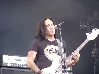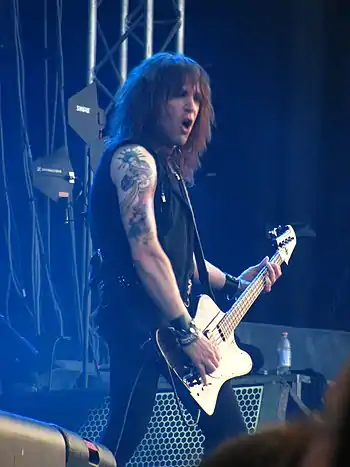 Thin Lizzy reformed in 1996, with Sykes taking over lead vocals and Marco Mendoza joining on bass, alongside returning members Gorham, Wharton and Downey.[15] Tommy Aldridge replaced Downey in 1998, and Wharton left in 2001 to focus on his own band Dare.[16] Mendoza and Aldridge left in 2003 to join Whitesnake,[17] with their places taken by Guy Pratt and Michael Lee, respectively.[18] Pratt was replaced later in the year by Randy Gregg.[19][20][21] Mendoza had returned to the band by early 2005,[22] as had Aldridge by early 2007.[23] Mendoza was replaced by Francesco DiCosmo later in 2007.[24] After more touring, Sykes departed Thin Lizzy in mid-2009, with DiCosmo and Aldridge leaving at the same time; speaking about the future of the band, Gorham claimed that "we will be back up to full speed soon".[25]