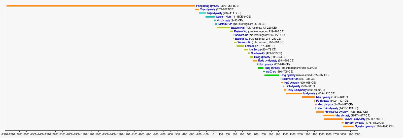 This list includes the various dynasties in the history of Vietnam, of both local and Chinese origins. Dynasties of China that ruled Vietnam are highlighted in orange. The Triệu dynasty is highlighted in light orange due to its disputed status.