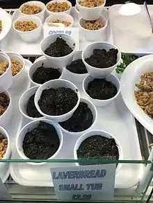 Laverbread, or Bara Lawr, is a Welsh speciality. It is made by cooking porphyra seaweed slowly over the course of up to ten hours[22] until it becomes a puree known as laver. The seaweed can also be cooked with oatmeal to make laverbread. It can be served with bacon and cockles as a breakfast dish,[23] or fried in to small patties.[24] Today, laverbread is commercially produced by washing in water, cooking for about 5 hours before chopping, salting and packaging.[25] |
