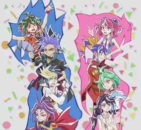 The key characters as they appear in Yu-Gi-Oh! Arc-V. From top to bottom: Yuya, Yuto, Yugo, and Yuri (left). Zuzu, Celina, Rin, and Lulu (right)