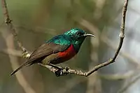 The indigobirds are finch-like species which usually have black or indigo predominating in their plumage. All are brood parasites, which lay their eggs in the nests of estrildid finches.