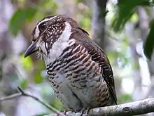 The mesites (Mesitornithidae) are a family of birds that are part of a clade (Columbimorphae) that include Columbiformes and Pterocliformes.[21] They are smallish flightless or near flightless birds endemic to Madagascar. They are the only family with more than two species in which every species is threatened (all three are listed as vulnerable).