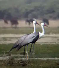 Bustards are large terrestrial birds mainly associated with dry open country and steppes in the Old World. They are omnivorous and nest on the ground. They walk steadily on strong legs and big toes, pecking for food as they go. They have long broad wings with "fingered" wingtips and striking patterns in flight. Many have interesting mating displays.
