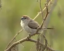 The estrildid finches are small passerine birds of the Old World tropics and Australasia. They are gregarious and often colonial seed eaters with short thick but pointed bills. They are all similar in structure and habits, but have wide variation in plumage colours and patterns.
