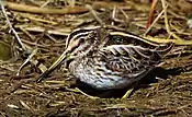 Nightjars are medium-sized nocturnal birds that usually nest on the ground. They have long wings, short legs and very short bills. Most have small feet, of little use for walking, and long pointed wings. Their soft plumage is camouflaged to resemble bark or leaves.