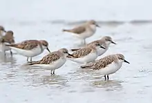 A total of 383 species of bird have been recorded living in the wild on the island of Tasmania, nearby islands and islands in Bass Strait. Birds of Macquarie Island are not included in this list. Twelve species are endemic to the island of Tasmania, and most of these are common and widespread.[1] However, the forty-spotted pardalote is rare and restricted, while the island's two breeding endemic species, the world's only migratory parrots, are both threatened.[2] 22 species are introduced, and 30 species are globally threatened.