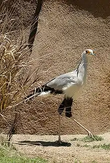 Bustards are large terrestrial birds mainly associated with dry open country and steppes in the Old World. They are omnivorous and nest on the ground. They walk steadily on strong legs and big toes, pecking for food as they go. They have long broad wings with "fingered" wingtips and striking patterns in flight. Many have interesting mating displays.