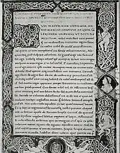The Diocletianic Persecution started on March 31, 302, with the Roman Emperor Diocletian, in a rescript from Alexandria, ordering that the leading Manichaeans be burnt alive along with their scriptures.[23][24] On the following year, on February 23, 303, Diocletian ordered that the newly built Christian church at Nicomedia be razed, its scriptures burned, and its treasures seized.[25] Later persecutions included the burning of both the Christians themselves and of their books. As related in later Christian Hagiography, at that time the governor of Valencia offered the deacon who would become known as Saint Vincent of Saragossa to have his life spared in exchange for his consigning Scripture to the fire. Vincent refused and let himself be executed instead. In religious paintings he is often depicted holding the book whose preservation he preferred to his own life (see illustration in Saint Vincent of Saragossa page.)[26] Conversely, many other Christians, less courageous, did save their lives by giving away their Scriptures to be burned. These came to be known as Traditores (literally, "those who give away") from which the modern word "traitor" is derived.