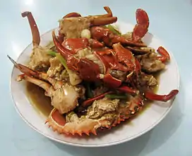- Crab in oyster sauce – a Chinese seafood dish of crab served in savoury oyster sauce. It is a popular dish in Asia, that can be found from China, Malaysia, Singapore, Indonesia to the Philippines.[4]