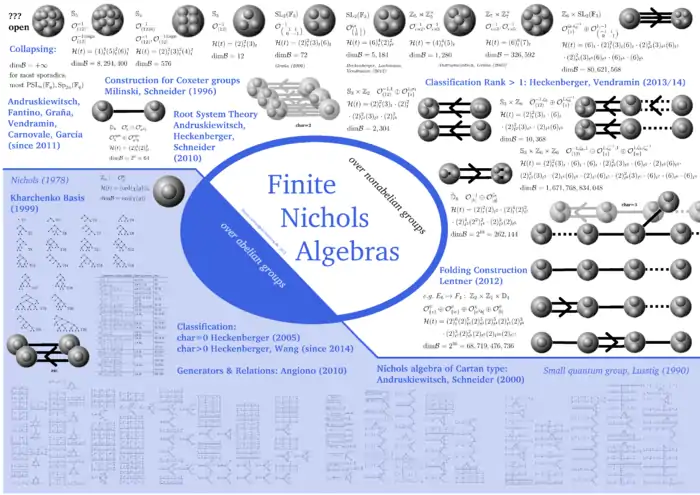 - Finite-dimensional Nichols algebras of semisimple Yetter–Drinfel'd modules of rank >1 over finite nonabelian groups (generated by the support) were classified by Heckenberger and Vendramin in.[6]