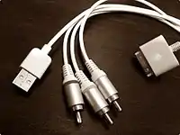| Apple Composite AV Cable | Allows the iPad or iPad 2 to be connected to any TV or home cinema system to allow Movies and other videos to be watched in stereo sound only on a TV from the iPad or iPad 2. This is achieved by plugging the wires into the composite video and audio plugs in a TV or home cinema system and into the 30-pin connector on the iPad or iPad 2. However, it will not mirror the display. | [9] | ||