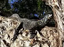 | 7 | Lace monitor | Varanus varius | Varanidae | 14 (30.87) more reliable[3] 20.5 (45.2), however, whether the measurements took into account the contents of the stomach in the form of four foxes, three small rabbits and three large blue-tongued skinks, is not specified.[10] | 2.0 (6.55)[3][4] A lizard from Mallacoota, Victoria measured 75 cm SVL, 192 cm TL Another from Healesville was 198 cm long[10] | ![]() |