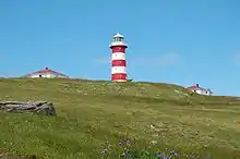 | New Férolle Peninsula Light | Image | 1913 | Reefs Harbour-Shoal Cove West-New Ferolle 51°01′21″N 57°05′44″W | Q (4) W 7.5s. | 28 metres (92 ft) | 2704 | H0149 | 20 |