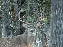 The mule deer (Odocoileus hemionus) is a deer whose habitat is in the western half of North America. It gets its name from its large mule-like ears. Adult male mule deer are called bucks, adult females are called does, and young of both sexes are called fawns. The black-tailed deer is considered by some a distinct species though it is classified as a subspecies of the mule deer. Unlike its cousin, the white-tailed deer, mule deer are generally more associated with the land west of the Missouri River. The most noticeable differences between whitetails and mule deer are the color of their tails and configuration of their antlers. The mule deer's tail is black tipped.[26]