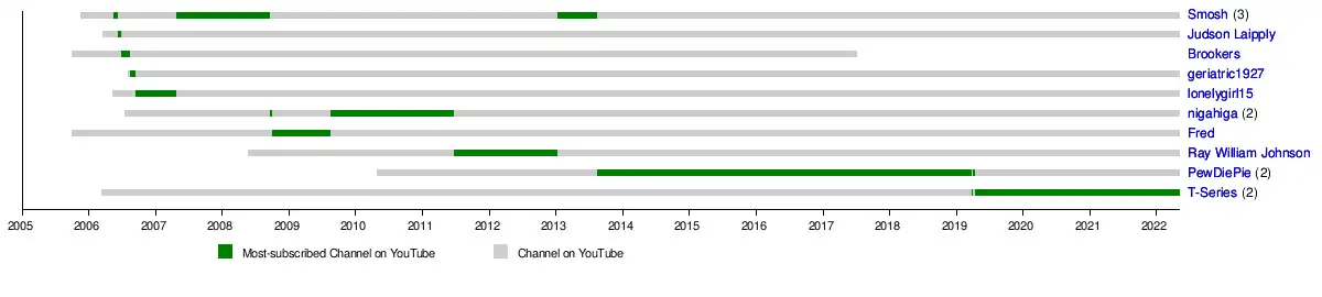 An early archive of the list dates to May 2006, at which time Smosh, with fewer than three thousand subscribers, occupied the number one position.[4] Since then, at least ten other YouTube channels have possessed the platform's largest subscriber count; these include Judson Laipply, Brookers, geriatric1927, lonelygirl15, Ryan Higa, Fred, Ray William Johnson and PewDiePie. The most-subscribed channel as of May 2022 is T-Series, an Indian music video publisher operated by the entertainment company of the same name. With a subscriber count of 209 million, the channel has held this distinction since April 14, 2019.