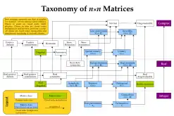 This article lists some important classes of matrices used in mathematics, science and engineering. A matrix (plural matrices, or less commonly matrixes) is a rectangular array of numbers called entries. Matrices have a long history of both study and application, leading to diverse ways of classifying matrices. A first group is matrices satisfying concrete conditions of the entries, including constant matrices. Important examples include the identity matrix given by