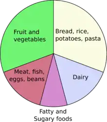 The United Kingdom's Department of Health published Dietary Reference Values. These are equivalent to the easier to understand Eatwell plate used by the National Health Service. This consists of roughly one-third fruit and vegetables ("at least 5 portions"); one-third bread, rice, potatoes and pasta ("plenty"); a smaller amount of milk and dairy ("some"); meat, fish, eggs and beans in the same proportion as dairy ("some"); and a small wedge of fatty and sugary foods.[35]
