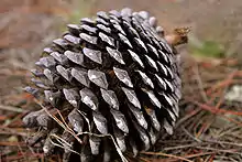 ![]() Monterey pine cone on forest floor |