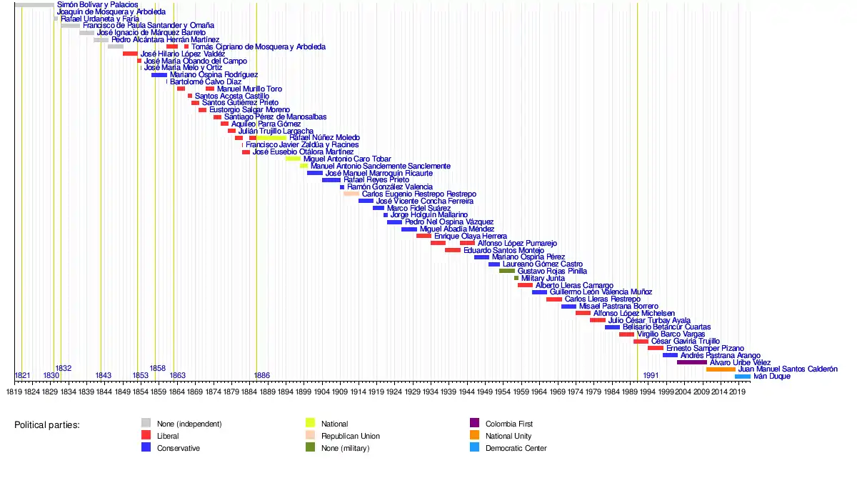 This list includes those persons who were sworn into or forcibly took the office of president of the Republic of Colombia following the passing of the Colombian Constitution of 1832, which took effect on 30 August 1821.