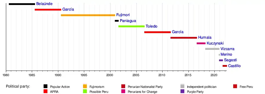 In the history of the position, there has been a series of political crises, caudillos, barracks revolt, civil wars, death of the incumbent, coups d'état, parliamentary attempts to remove the presidency,[1] one autocoup, and vacancies dictated by the congress. The list is based on the work of the historian Jorge Basadre, constitutions, laws, and decrees in each case. Even though they were not presidents, the list includes the liberators José de San Martín and Simón Bolívar due to their historical relevance in the independence of Peru and its consolidation.