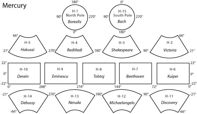 The surface of the planet Mercury has been divided into fifteen quadrangles, designated H-1 to H-15 (the 'H' stands for Hermes, the Greek equivalent of Mercury).[1] The quadrangles are named for prominent surface features visible within each area.[1] The quadrangles were initially named for albedo features, as these were the most prominent features visible before mapping was carried out by spacecraft. The mapping carried out with the images obtained by the Mariner 10 flybys in 1974 and 1975 led to nine of the quadrangles being renamed for newly mapped prominent features.[1] The remaining six quadrangles were completely unmapped by Mariner 10 and were still referred to by their albedo feature names. Following the arrival of MESSENGER in orbit in 2011, these six quadrangles were mapped and renamed.[2] The base mosaic used in the new maps was produced with orbital images by the MESSENGER Team and released by NASA’s Planetary Data System on March 8, 2013. This global mosaic includes 100% coverage of Mercury’s surface.