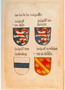 The Ludovingian coat of arms, shown as the coat of arms of the landgraves of both Hesse and Thüringen in the Ingeram Codex of 1459.