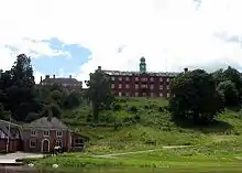 Shrewsbury School viewed from The Quarry, with the school's boathouse in the foreground.