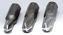 The Pozidriv, sometimes incorrectly spelled "Pozidrive", is an improved version of the Phillips screw drive. It is designated "Type IA" by ANSI standards.[20] and "Type Z" in ISO documents. The Pozidriv was patented by GKN Screws and Fasteners in 1962.[21][22] It was designed to allow more torque to be applied and greater engagement than Phillips drives. As a result, the Pozidriv is less likely to cam out.[10][23][24] It is similar to, and compatible with, the Supadriv screw drive.[25]