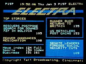 Perhaps the most prominent of American teletext providers was the Electra teletext service, using WST, which was broadcast starting in the early 1980s on the vertical blanking interval (VBI) of the American cable channel WTBS. Electra was owned and operated by Taft Broadcasting and Satellite Syndicated Systems (SSS). Electra ran up until 1993, when it was shut down due to Zenith, the prominent (and only) American TV manufacturer at the time offering teletext features in their sets decided to discontinue such features, as well as a lack of funding and lagging interest in teletext by the American consumer.