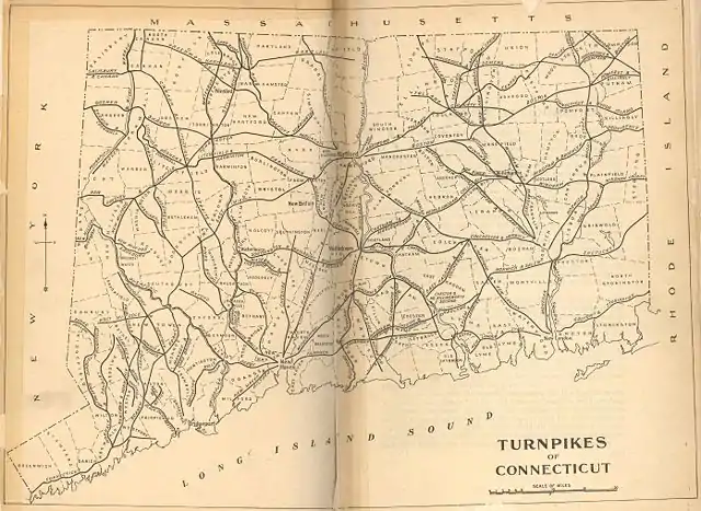 | Straits Turnpike | October 1797 | New Haven - Naugatuck - Watertown - Litchfield | Route 69, Litchfield Turnpike, Route 63 | |