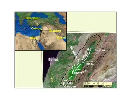 The Litani River (Arabic: نهر الليطاني, romanized: Nahr al-Līṭānī), the classical Leontes (Greek: Λέοντες, translit. Léontes, lit. "lions"), is an important water resource in southern Lebanon. The river rises in the fertile Beqaa Valley, west of Baalbek, and empties into the Mediterranean Sea north of Tyre. Exceeding 140 km in length, the Litani River is the longest river in Lebanon and provides an average annual flow estimated at 920 million cubic meters.[1][2] The waters of the Litani both originate and flow entirely within the borders of Lebanon. It provides a major source for water supply, irrigation and hydroelectricity both within Southern Lebanon, and the country as a whole.