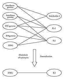 The language in scientific articles often include ambiguities, and an important step for coeherent parsing of the literature is the extracion of the sense of each term in the context they are used, a task called Word Sense Disambiguation (WSD).[59] For example, terms for genes like CT (PCYT1A) called and MR (NR3C2) can be confused with the acronyms for Computational Tomography and Magnetic Ressonance, requiring sofisticated disambiguation systems.[60] Terms are often reconciled to ontologies or other sources of unique identifiers, such as the Unified Medical Language System (UMLS).[61] This process of mapping multiple different utterances to a single name or identifier is called normalization.[57]