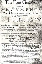 It is in the mid 17th century that the first evidence of a distinctive and sustained literary culture emerges within Birmingham, based around a group of writers working at the heart of the town's growth as a centre of religious puritanism and political radicalism. John Barton, the headmaster of King Edward's School, was the author of The Art of Rhetorick in 1634 and The Latine Grammar composed in the English Tongue in 1652,[7] but is best known for Prince Rupert's burning love for England, discovered in Birmingham's flames – a widely circulated, influential and vitriolic anti-Royalist tract that documented the sacking of the town by Prince Rupert of the Rhine at the Battle of Birmingham of 1643.[8] Anthony Burgess wrote numerous sermons and theological works while the rector of Sutton Coldfield between 1635 and 1662, entering into a prolonged if amicable theological dispute in print with Richard Baxter that culminated in a face-to-face debate in Birmingham in September 1650.[9] Francis Roberts was similarly prolific during his tenure as vicar of Birmingham's St Martin in the Bull Ring, with many of his works of popular or scholarly theology becoming nationally-known and running through numerous editions.[10] Thomas Hall was the master of the King's Norton Grammar School from 1629, and the minister of the adjacent St Nicolas' Church from 1650, but from the 1630s onwards was drawn into the radical circles of nearby Birmingham. He was the author of a long series of polemical works, combining both populist and erudite writing on religious and social matters.[11] His 1652 volume The Font Guarded – a defence of the practice of infant baptism – was the first book known to have been published as well as written in Birmingham, and provides the first definite evidence of booksellers operating within the town.[12] Between 1635 and 1642 Roberts, Hall and Barton were involved in establishing the first Birmingham Library, one of the earliest public libraries in England.[13]