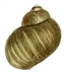 The shell is globular, light grey to greenish yellow or dark.[6] The shell has 4.5-5 whorls.[14] The last whorl is predominating.[6] Dimensions of the shell are 7–10 mm × 7–10 mm.[6] Or the width of the shell is 6.5–8 mm.[14] The height of the shell is 7–9 mm.[14]