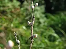 The greenish white, funnel-shaped flowers, appearing June – July, measure 3 – 4 mm across and are borne in short, dense cymose clusters within the leaf axils. When in fruit, the inflorescences form a V-shaped, elongated spray.[3] The fruits comprise 4 shiny white nutlets that measure 3 – 4 mm long and persist well into winter.[2]