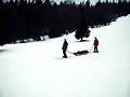 After the person is secured in the litter, the litter may be wheeled, carried by hand, mounted on an ATV, towed behind skis, snowmobile, or horse, lifted or lowered on high angle ropes, or hoisted by helicopter.