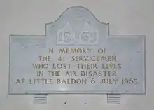 On Sunday 9 April 1967 a wall-mounted marble monument to the victims in the Church of England parish church of St Lawrence, Toot Baldon was dedicated at a special service.[9] There is a small roll of honour beneath, and an RAF ensign and a standard of the Oxford Branch of the Parachute Regimental Association flank the monument. Wreaths are laid at the monument during an annual commemorative service at the church, usually on the first Sunday in July.[10]