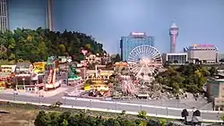 The Toronto destination, which took over 35,000 hours to design and build, includes GO Transit trains and Union Station, helicopters, streetcars,[3] and the Gardiner Expressway.[4] During the morning portion, sound effects include chirping birds, barking dogs, and garbage trucks making rounds.[3] During the sunset portion of the exhibit, the skyline is lit by 30,000 LEDs,[3] with sounds of crickets and sirens.[7] The replica of the Rogers Centre, which cost $60,000 to build and occupies a space of 5 by 5 feet (1.5 by 1.5 m),[4] has a functional retractable roof and contains a scoreboard that will show highlights from the preceding day's Toronto Blue Jays game.[3] The field depicts the instance Joe Carter hit a walk-off home run to clinch the Blue Jays' victory in the 1993 World Series against the Philadelphia Phillies.[7]