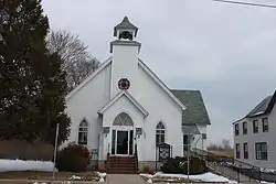 Little Creek Methodist Church is a historic Methodist church located on Main Street in Little Creek, Kent County, Delaware. It was built in 1883, and is an ell-shaped, one-story frame building in the Late Gothic Revival style. It has a gable roof and square bell tower topped with a tapered, pyramidal cupola housing the bell. The bell tower has a circular, recessed, stained glass "rose" window.[2]