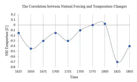 Scientists pointed out several natural causes of the Little Ice Age, e.g. volcanic activity, orbital cycles, decreased solar activity and Greenhouse gas. Gabriele C. Hegerl compared the different forcing of Little Ice Age based on various studies.[22] An energy balance model was simulated, with volcanic, solar and greenhouse gas signals as parameters. They created various models to calculate the correlation between natural forcing and temperature change. It showed natural forcing acted as an important role in temperature change (Fig. 5). Also, the research also compared the contribution of temperature change among three natural factors.[22] Volcanic activities was the main driver of the Little Ice Age (Fig. 7),[22] because volcanism was the largest forcing.
