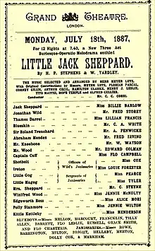 Little Jack Sheppard opened at the Gaiety Theatre in London on 26 December 1885 and ran for 155 performances. It featured Nellie Farren as Jack Sheppard, Fred Leslie as Jonathan Wild, David James as Blueskin and Marion Hood as Winifred[11] Other cast members included Willie Warde (who also choreographed the dances) and Sylvia Grey. The production marked the first appearances at the Gaiety of David James and Fred Leslie, and it was Marion Hood's first appearance in burlesque.[12] Leslie introduced parodic elements caricaturing Oscar Wilde into his portrayal of Jonathan Wild[13] In June 1886, the production was moved from the Gaiety to the less fashionable Grand Theatre, Islington, to make way for Henry E. Dixey's company.[14] A new cast was engaged for the Islington production, while a touring company including most of the original principals took the piece around the English provinces.[15] In December 1886, the touring company, still led by Farren and Leslie, returned to London and took over at the Grand Theatre.[16]