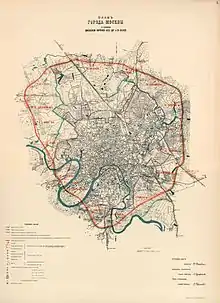 In 1800, the Kamer-Kollezhsky Val became the legal outer border of Moscow. In 1879, some additional areas, including Sokolniki, were annexed to the city; however, at the time Moscow was encircled by a number of further settlements forming an urban agglomeration. Transport connections between these suburbs were poor. A number of proposals to build a ring railroad around the center to solve this were made in the 1860s and the 1870s. One such project was rejected in 1877 by the Moscow City Duma which cited inefficiency.[2] However, the transportation problems became increasingly obvious, and in 1898 after Tsar Nicholas II sent a message to the City Duma declaring that it was desirable to build a railroad, a project competition was opened. The project by Pyotr Rashevsky, who proposed to build a ring of the total length of 54.4 kilometres (33.8 mi), won the competition.[3]
