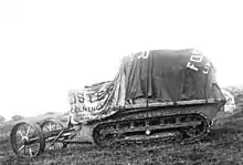 On 11 August actual construction began; on 16 August Tritton decided to fit a wheeled tail to assist in steering. On 9 September the Number 1 Lincoln Machine, as the prototype was then known, made its first test run in the yard of the Wellington Foundry. It soon became clear that the track profiles were so flat that ground resistance during a turn was excessive. To solve this, the suspension was changed so that the bottom profile was more curved. Then the next problem showed up: when crossing a trench the track sagged and then would not fit the wheels again and jammed. The tracks were also not up to carrying the weight of the vehicle (about 16 tons). Tritton and Lieutenant Walter Gordon Wilson tried several types of alternative track design, including balatá belting and flat wire ropes. Tritton, on 22 September, devised a robust but outwardly crude system using pressed steel plates riveted to cast links and incorporated guides to engage on the inside of the track frame. The track frames as a whole were connected to the main body by large spindles.[1] This system was unsprung, as the tracks were held firmly in place, able to move in only one plane. This was a successful design and was used on all First World War British tanks up to the Mark VIII, although it limited speed.
