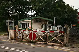 There is a level crossing at the eastern (London) end of the platforms, where the line crosses Rusper Road. The crossing gates were considered for replacement with modern barriers in the early 1990s but as there was a history of late passengers running over the crossing to catch their train it was dismissed. Therefore, the adjacent signal box was manned 24 hours a day. In October 2012 the level crossing was rebuilt and automatic barriers installed to replace the old fashioned gates. This meant that the crossing operator's job was now redundant, with CCTV used to control the crossing from the Three Bridges signal centre.[3] This upgrade was finally made necessary due to a number of incidents of people driving through the wooden gates when closed, resulting in expensive replacement gates having to be constructed.[4][5]