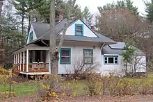 The Nashua, Acton and Boston Railroad, which ran from Concord to Nashua, ran through Westford with two stations near the eastern part of Littleton. Passenger service on the line ran from 1876 to 1924; it was abandoned entirely in 1925.[3] East Littleton station was located at Littleton Road (MA 110), about a mile east of Littleton Common.[27] It received frequent shipments of coal and grain for the Conant and Company store nearby.[4]: 249 Pine Ridge station (also known as Westford) was located at Patten Road.[3][27] The former station building has been converted to a private residence; the former freight house and section house are used as outbuildings.[5]: 215