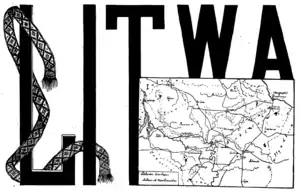 Litwa used different nameplates each year.[12] The nameplate of the first issue effectively defined which Lithuania it would write about – it included a traditional folk sash wrapping around the letter L[12] and a map of ethnographic Lithuania and not of historic Lithuania (i.e. the Grand Duchy of Lithuania).[13] The map was prepared and first published by Mečislovas Vasiliauskas in 1907.[14]