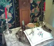 After the lity the priests and deacons go to the middle of the church to a table prepared beforehand with five loaves of leavened bread, the artoklasia loaves, bottles of wine and olive oil and, in the Russian tradition, also a dish containing wheat kernels.