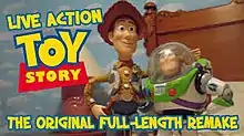 Live Action Toy Story is a 2012 comedy-adventure fan film produced by the Arizona-based Jonason Pauley and Jesse Perrotta; it is a shot-by-shot recreation of the 1995 computer-animated film of the same name, with the toy characters animated through stop-motion or filmed moving with wires and strings.[1]