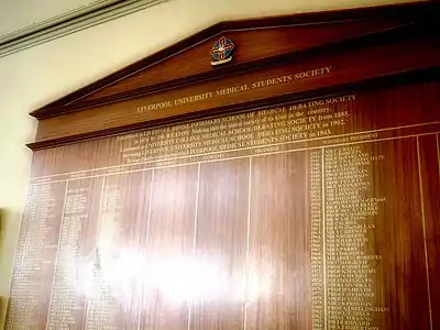 The Society records the names of its Student Officers and Honorary Presidents in the Jack Leggate Theatre of the Victoria Gallery & Museum. Previous Honorary Presidents of the Society have included Henry Cohen, 1st Baron Cohen of Birkenhead, Professor Sir Ian Gilmore, Professor Sir Cyril A. Clarke KBE, and Professor Thomas Cecil Gray CBE KCSG. It's plaque reads: